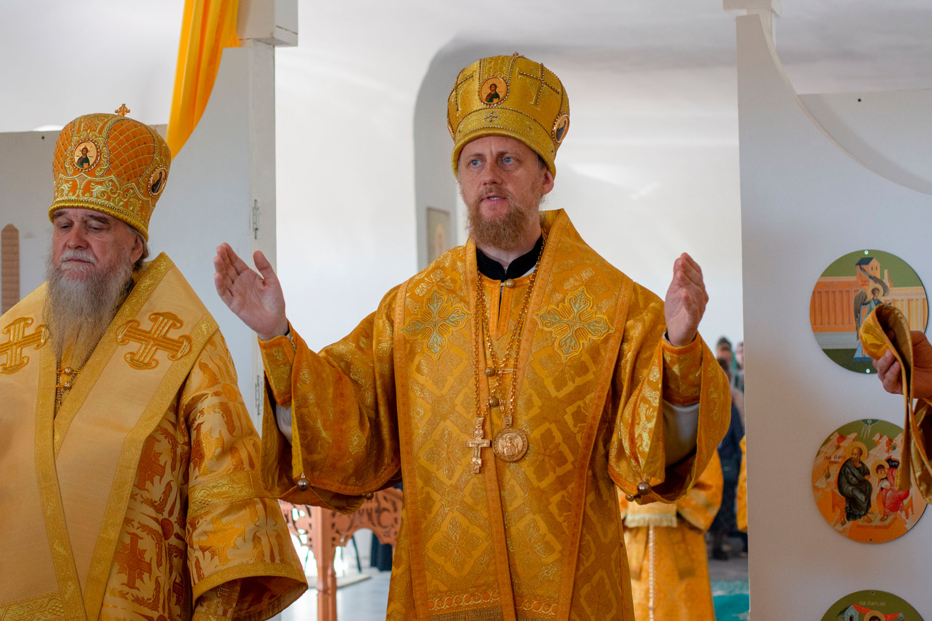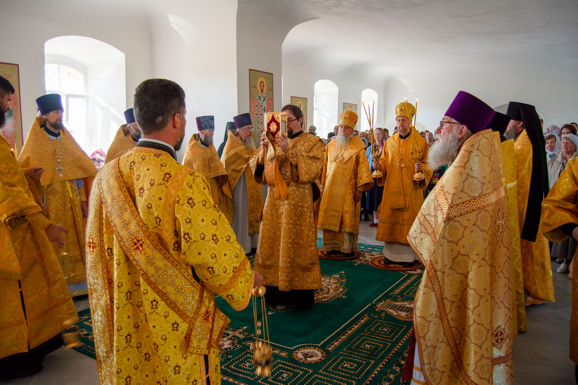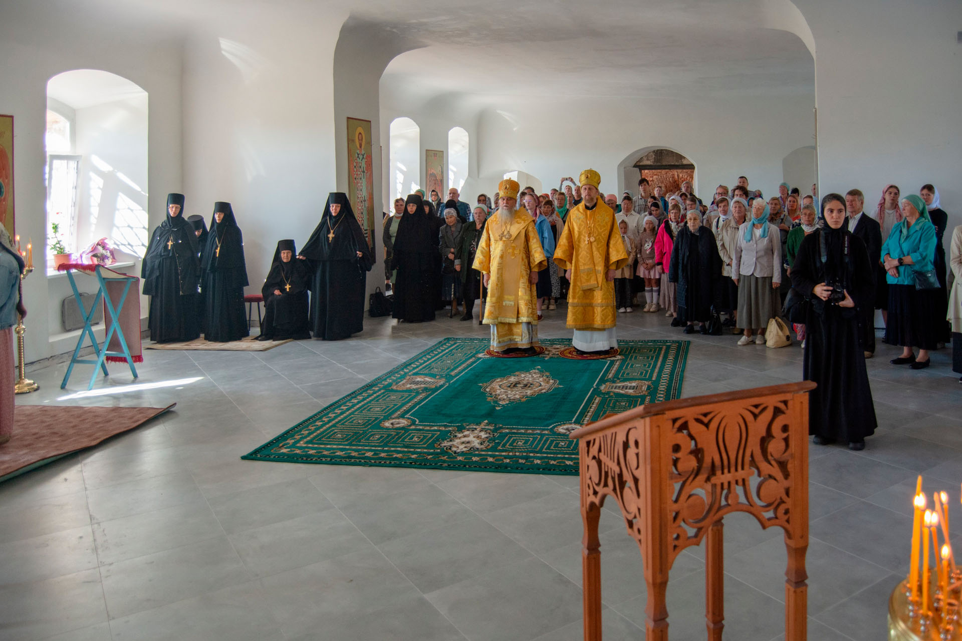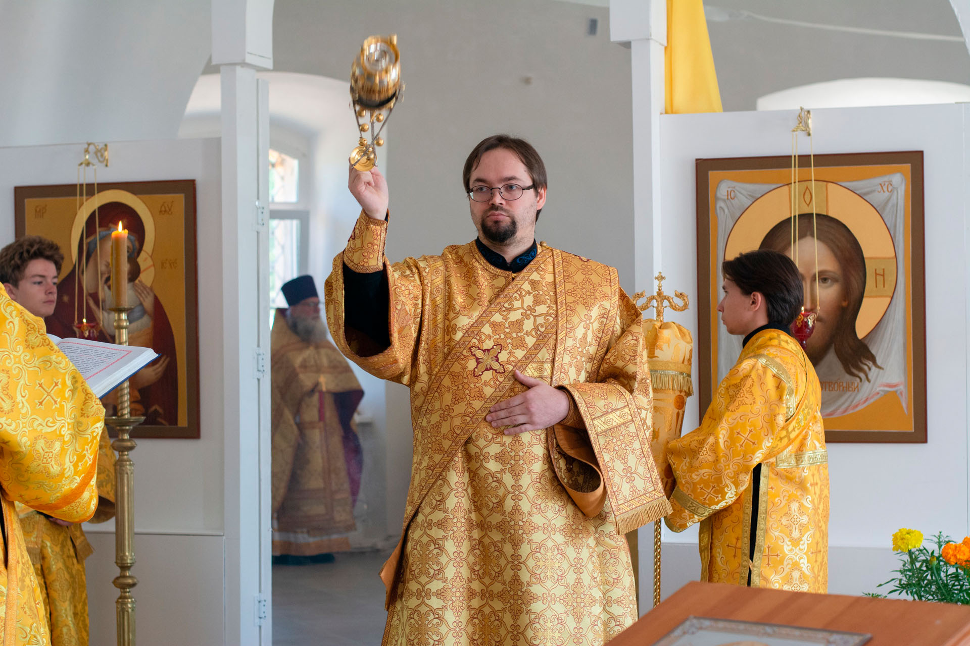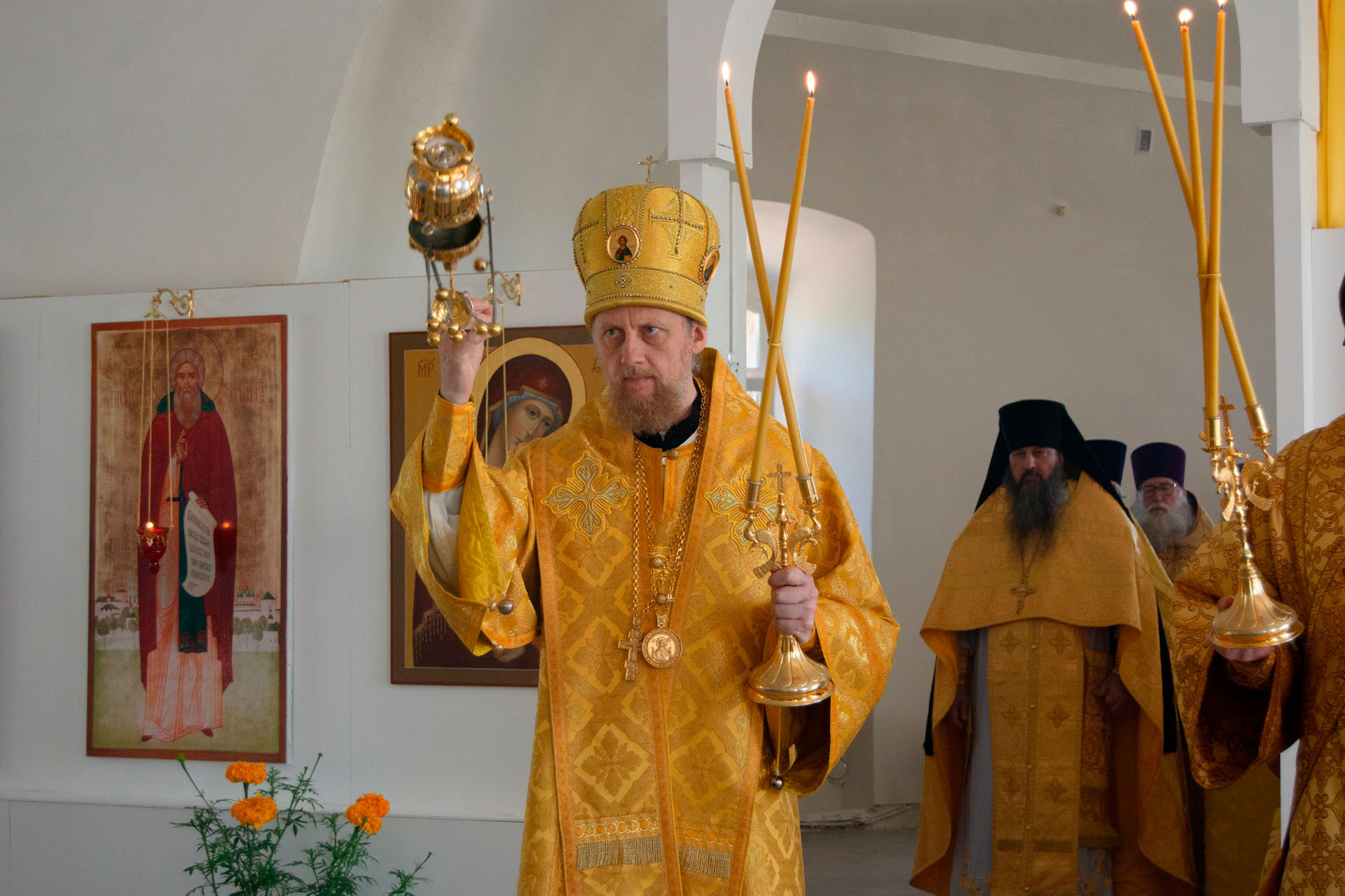 15 августа в годовщину блаженной кончины старицы Ксении Красавиной в новом приписном храме Богоявленского женского монастыря - храме Живоначальной Троицы села Архангельского епископ Рыбинский и Романово-Борисоглебский Вениамин совершил Литургию.